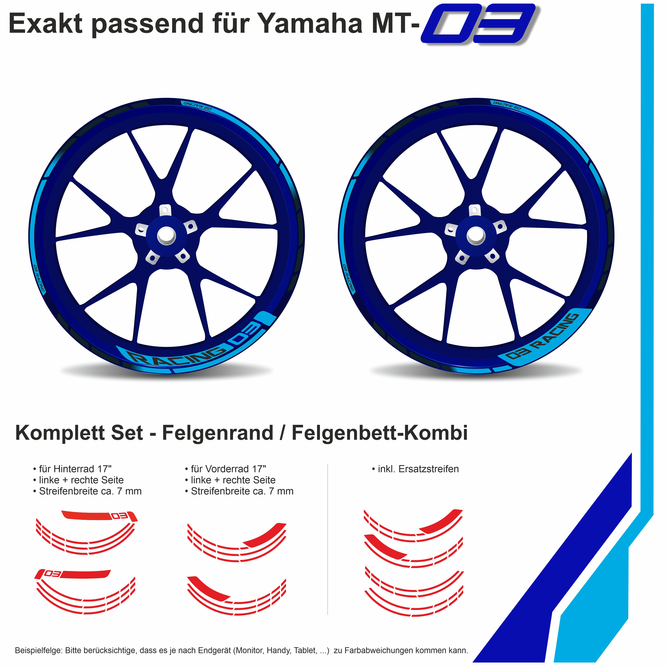 Felgenrand Sticker Klebeset Motorradfelge kompatibel für Yamaha Icon Blue MT-03