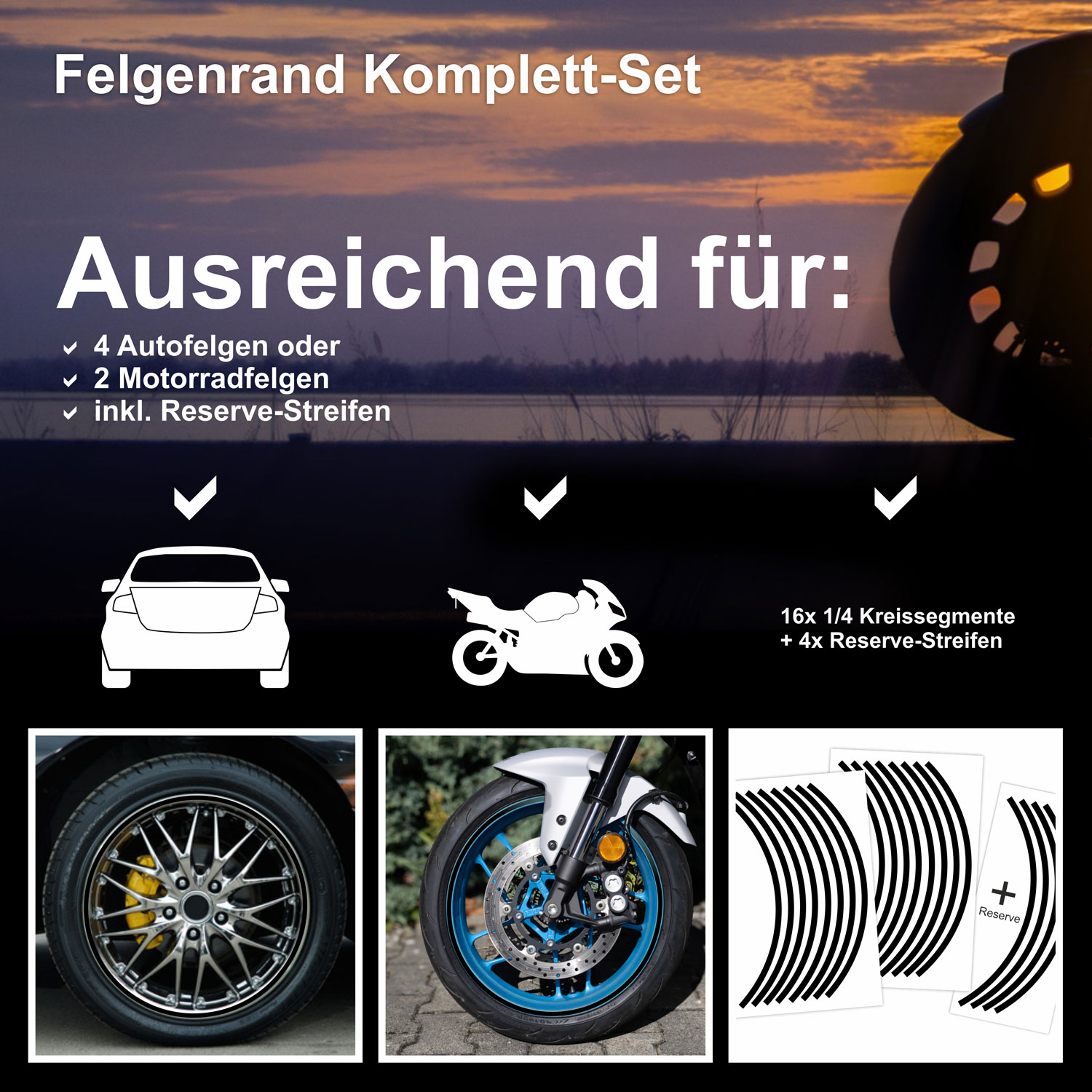 Eigenschaften "Felgenrand schwarz matt Classic Aufkleber-Set für 16 17 18 Zoll Auto und Motorrad"