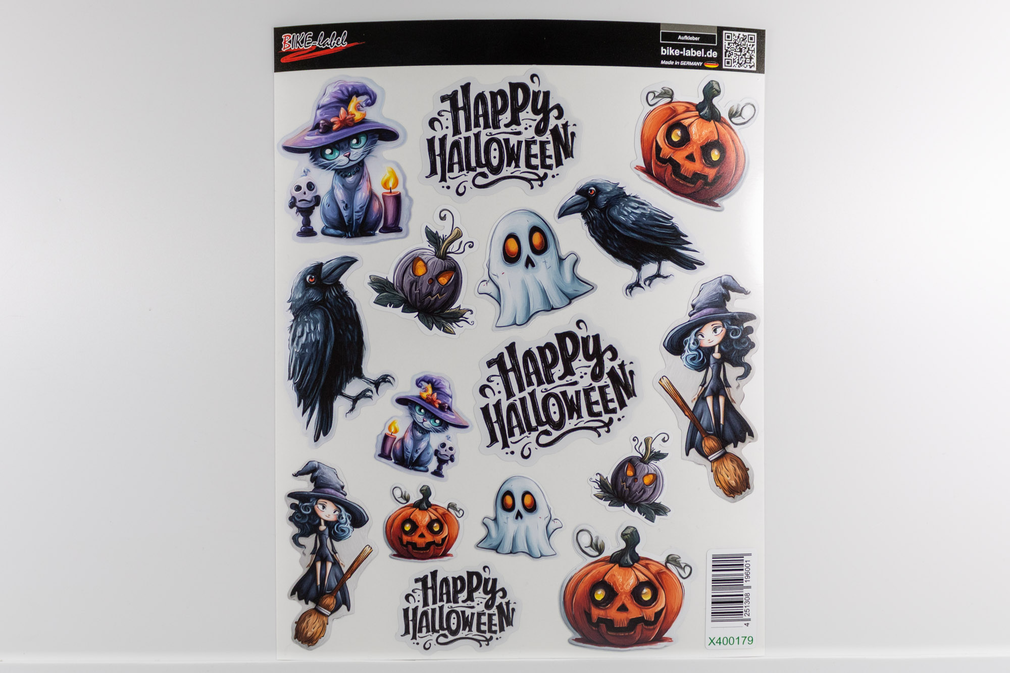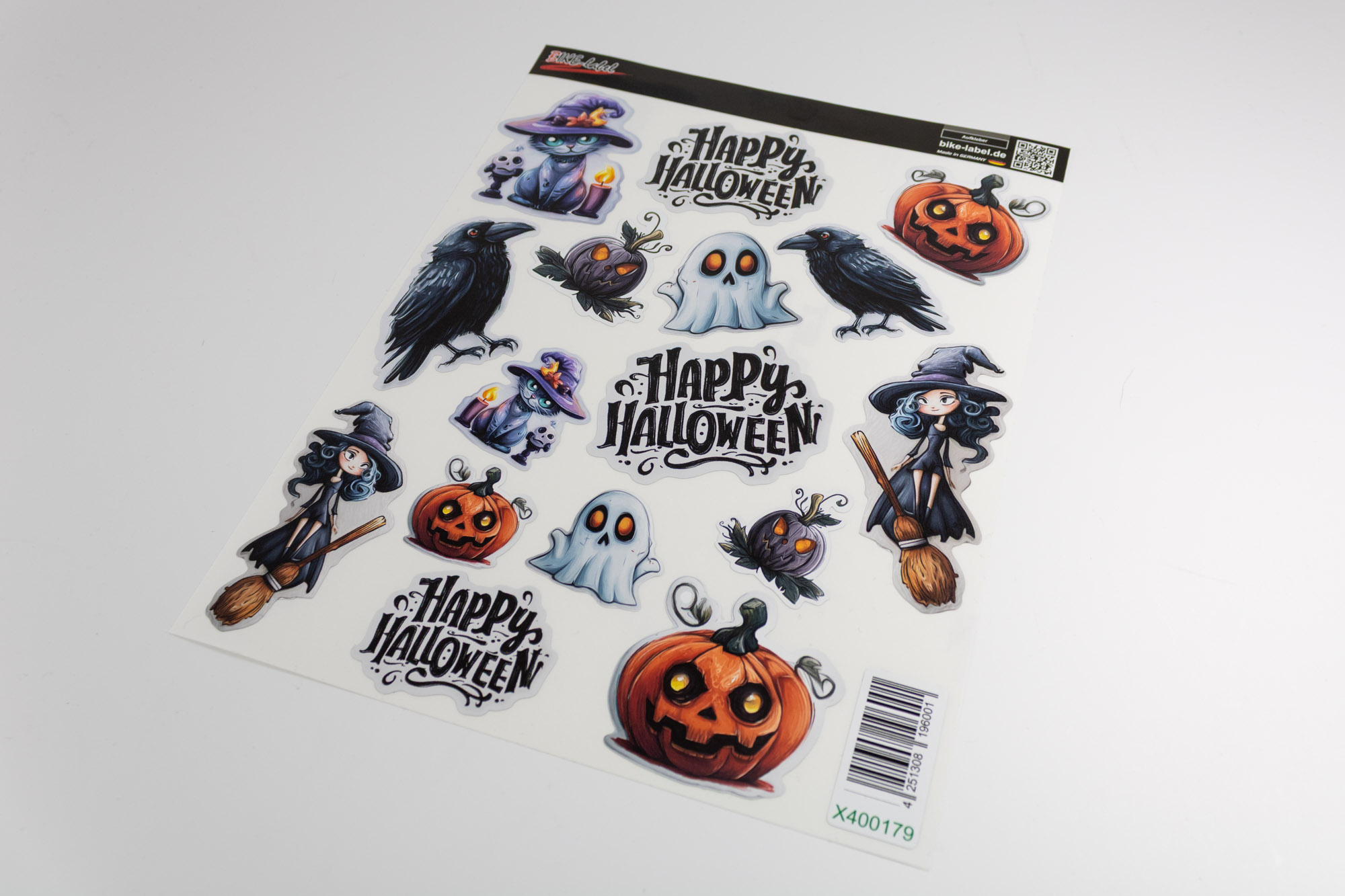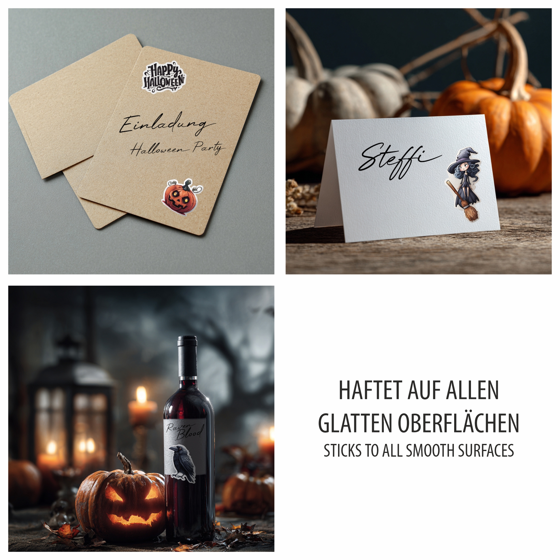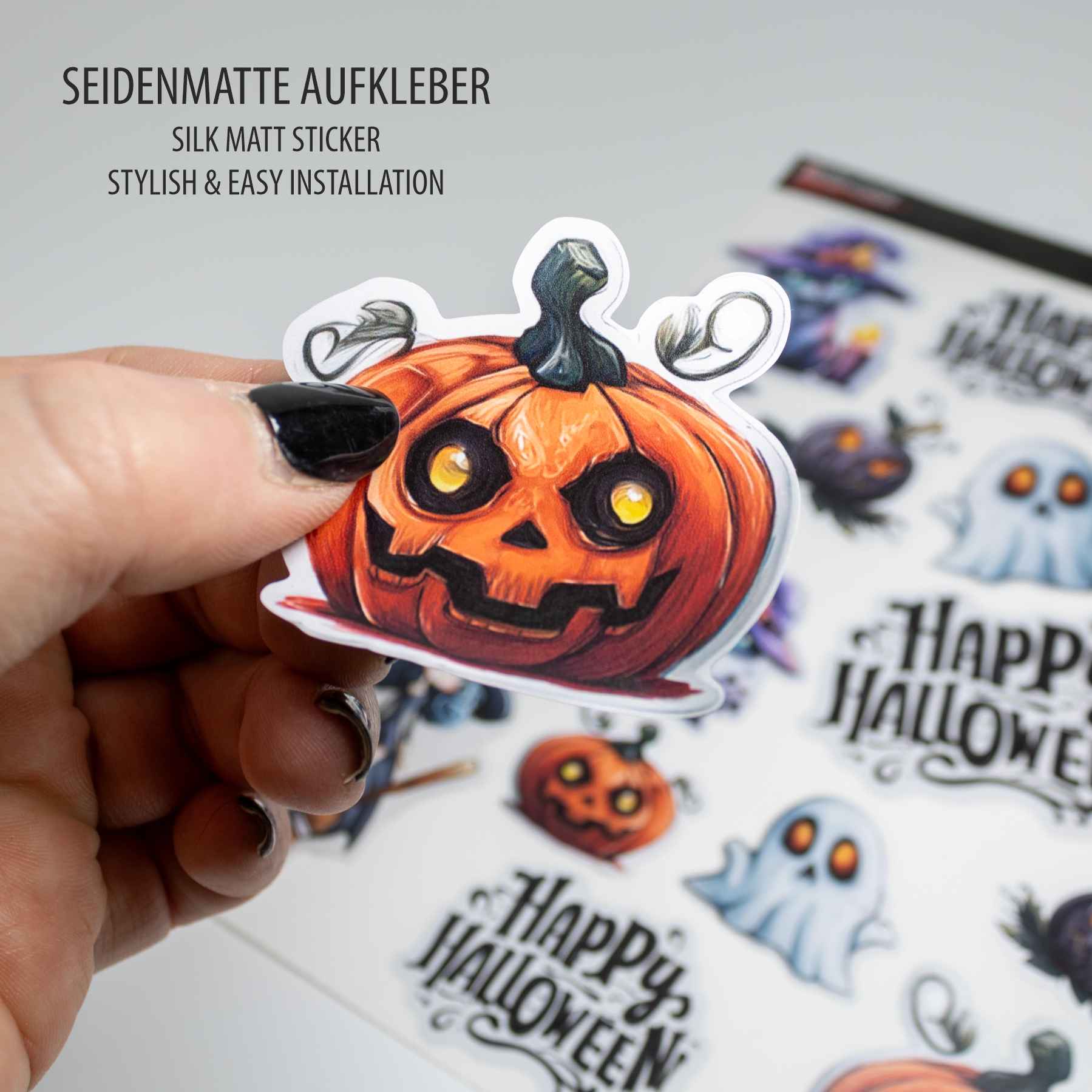 Unsere Happy Halloween-Sticker mit seidenmatten finish bringen sofort gruselig-bunte Stimmung – egal ob auf Fenstern, Autos, Postkarten, Laptops oder Handys.