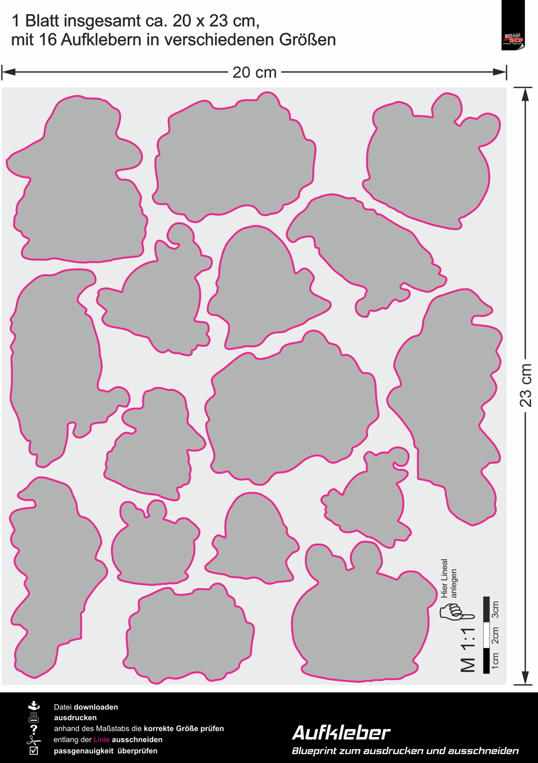 Hinweis: Größe und Stückzahl der Sticker sind im Produktbild anhand der Maßstabszeichnung ersichtlich.