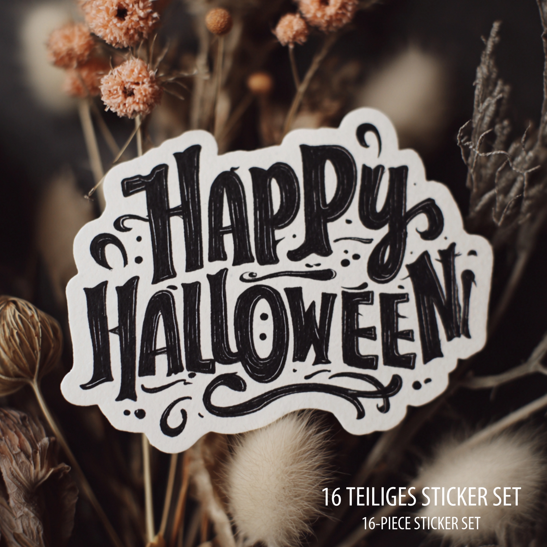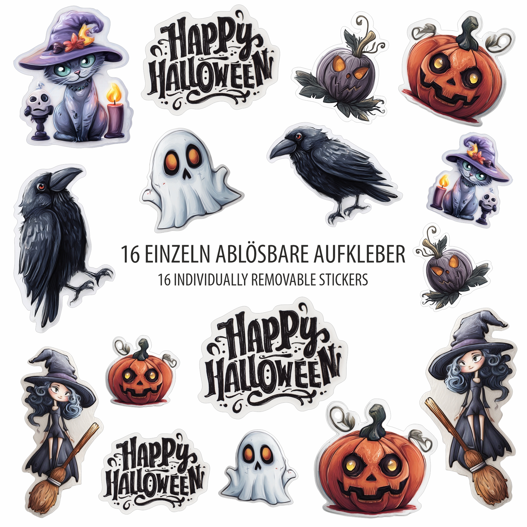 Happy Halloween – 16 Bunte seidenmatte Sticker mit Katze, Hexe, Kürbis für Fenster, Karten & mehr