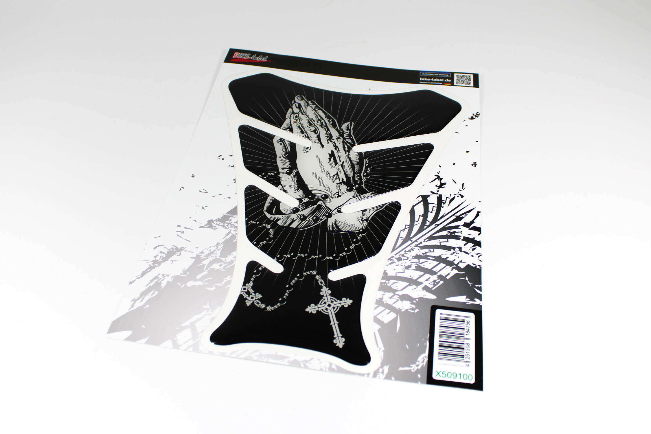 Eigenschaften "Tankpad Motorradtank Sticker Schutzaufkleber Bikergottesdienst Hände mit Kreuzkette"